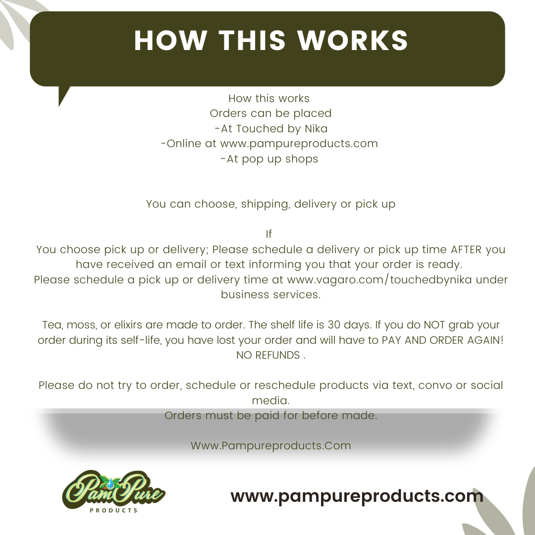 PamPure 64oz Sea Moss Teas ARE ALL formulated to drink 8oz per day!!! That means you get 8 doses of 102 minerals in each jug!!! PamPure Sea Moss Teas comes in the flavor of your choice; Peach, Cinnamon, Elderberry or Pineapple. Each jug is bpa free. Subscribers will receive their Teas in a glass mason jar that will be returned after a new Tea is received. Be sure to keep it refrigerated, Shake it well and drink it hot or cold! Please discard after 1 month of ordering!!!
